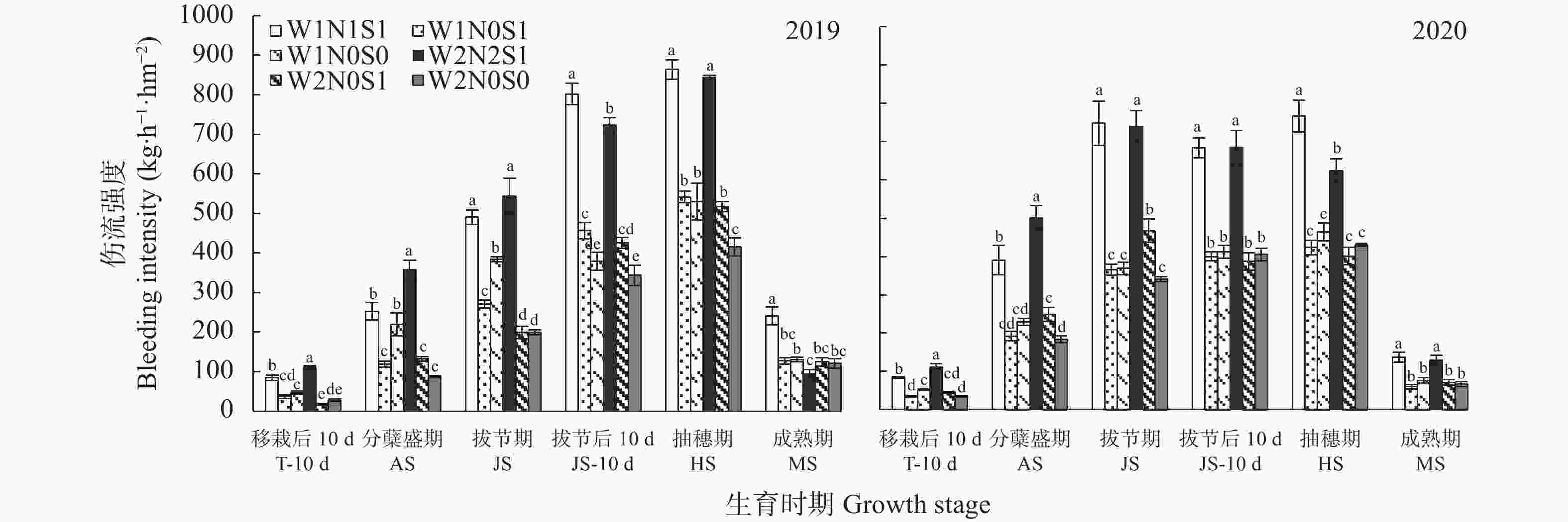 −2 of N applied at ratios of basal∶tillering∶panicle fertilizers of 3∶3∶4 (N1), 7∶3∶0 (N2), and 0 (N0). The results showed that compared with W2, W1 promoted straw decomposition before the jointing stage, increased the total organic acid content of rhizosphere soil after the jointing period (1.38%–8.49%) and microbial biomass C content of rhizosphere soil before maturity (0.25%–12.93%), increased root activity during the entire growth period, and increased root morphological indices of the rice population, except at 10 days after transplanting and at the mature stage (18.53%–75.83% of root length, 10.57%–101.33% of root number, 2.49%–88.24% of root volume, and 8.91%−68.08% of root surface area). Compared with W1, W2 increase the total organic acids (3.34%) and microbial biomass C content (2.69%–6.23%) at the mature stage, and the decomposition of straw and the root morphological indices of single stems (12.03%–27.21% of root length and 9.05%–51.44% of root number). Compared with S0, S1 treatment inhibited root morphology development and reduced root activity (2.47%–45.83%), but increased the total organic acid content (8.02%–22.74%) and microbial biomass C and N levels of rhizosphere soil (1.58–31.22%), and the effect of improvement was highly noticeable under W1. The application of N fertilizer promoted the decomposition of straw, increased the total organic acids and microbial biomass C and N contents of rhizosphere soil, promoted root development, and increased root activity. Compared with N0, the optimal N application mode (N1) promoted the root development of single stems (8.27%–38.09% of root length and 2.96%–36.66% of root number) and promoted and maintained the root activity (2.26%–156.35%) in the middle and late growth stages; whereas the conventional N application mode (N2) increased the population root index (12.68%–44.32% of root volume and 4.91%–55.82% of root surface area) and root activity only in the early growth stage (22.01%–29.31%). W1 irrigation coupled with optimized N application promoted straw decomposition, significantly accelerated root growth and development, increased total organic acid content, microbial biomass C and N contents, and root activity in rhizosphere soil, and delayed root senescence. Therefore, under the condition of straw return, the optimized N application mode with W1 is the most suitable agriculture model.